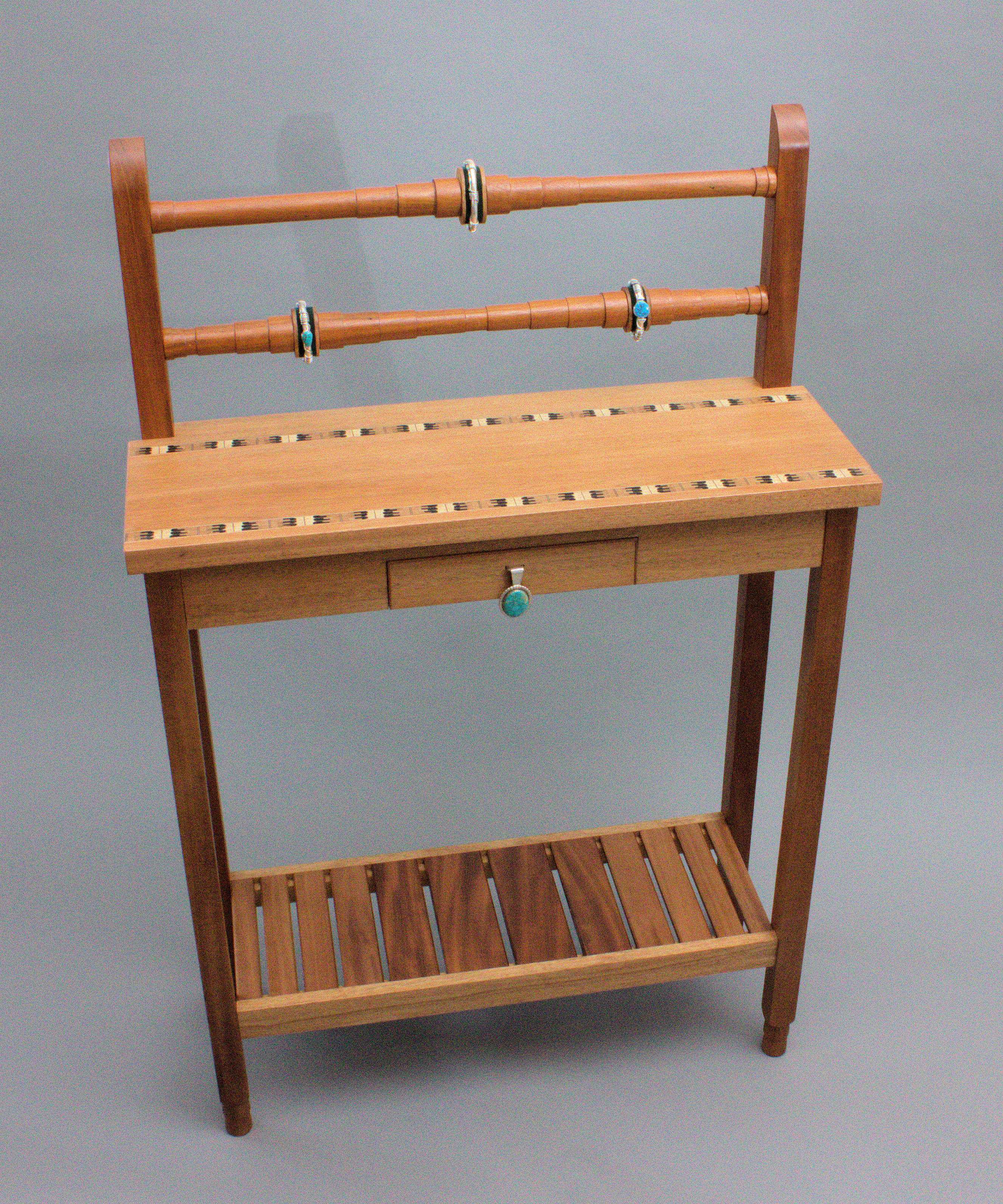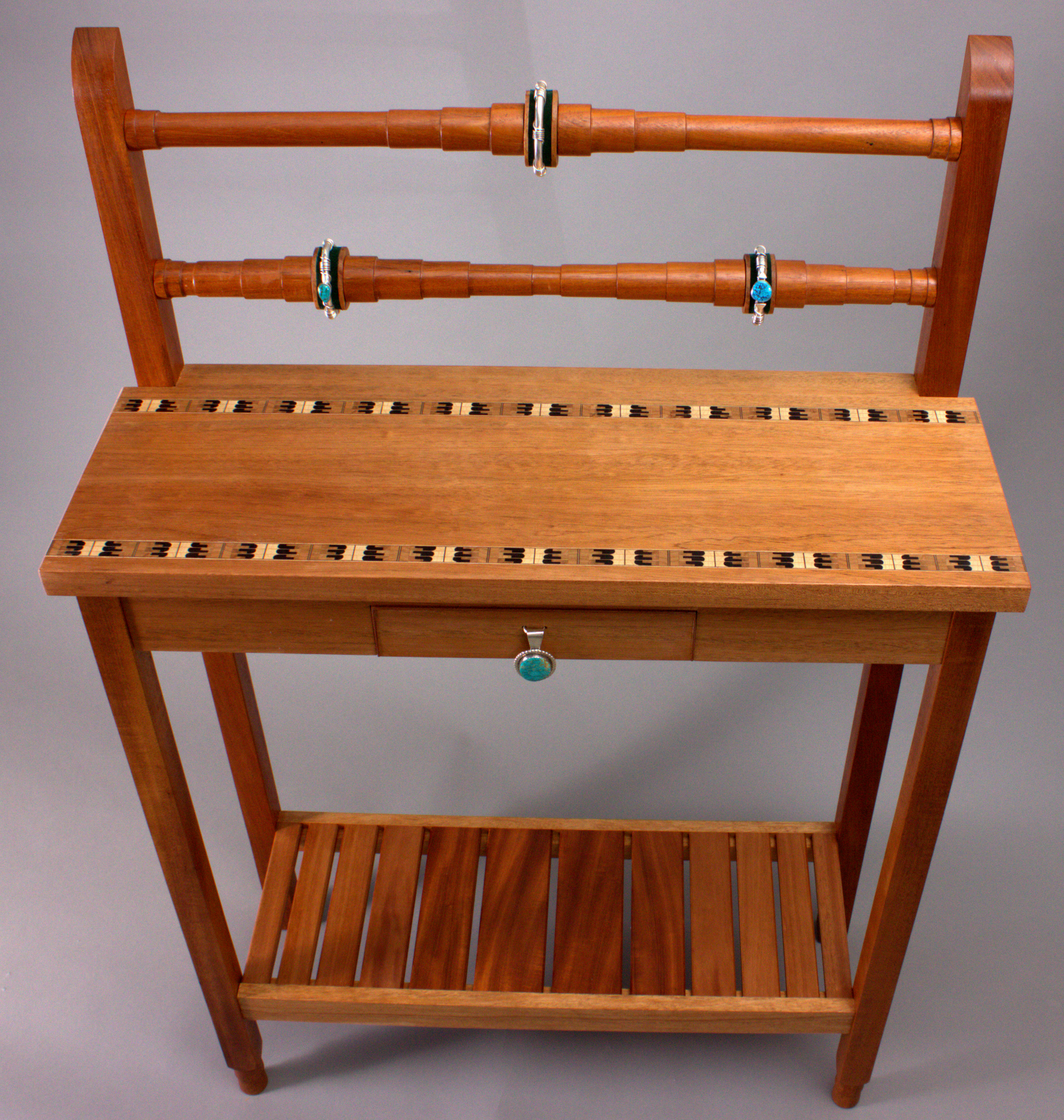 I recently offered to donate a piece of my furniture for the Museum of Northern Arizona to auction in their annual Gala and they accepted. With their expertise guiding me I selected 4 pieces of locally made jewelry to add some "bling" to the side table designed expressly for the event. And after insightful help from a museum anthropologist (leading to a little re-design), I built this table. The inlay is all hand-made in my shop and the silver and turquoise bracelets are removable for wearing. A cache of mahogany came into my hands from a barn in El Paso, Texas, where it sat, undisturbed for over 50 years. The spectacular jewelry that adorns this table cried out for a noble wood without showy grain and the mahogany was perfect.