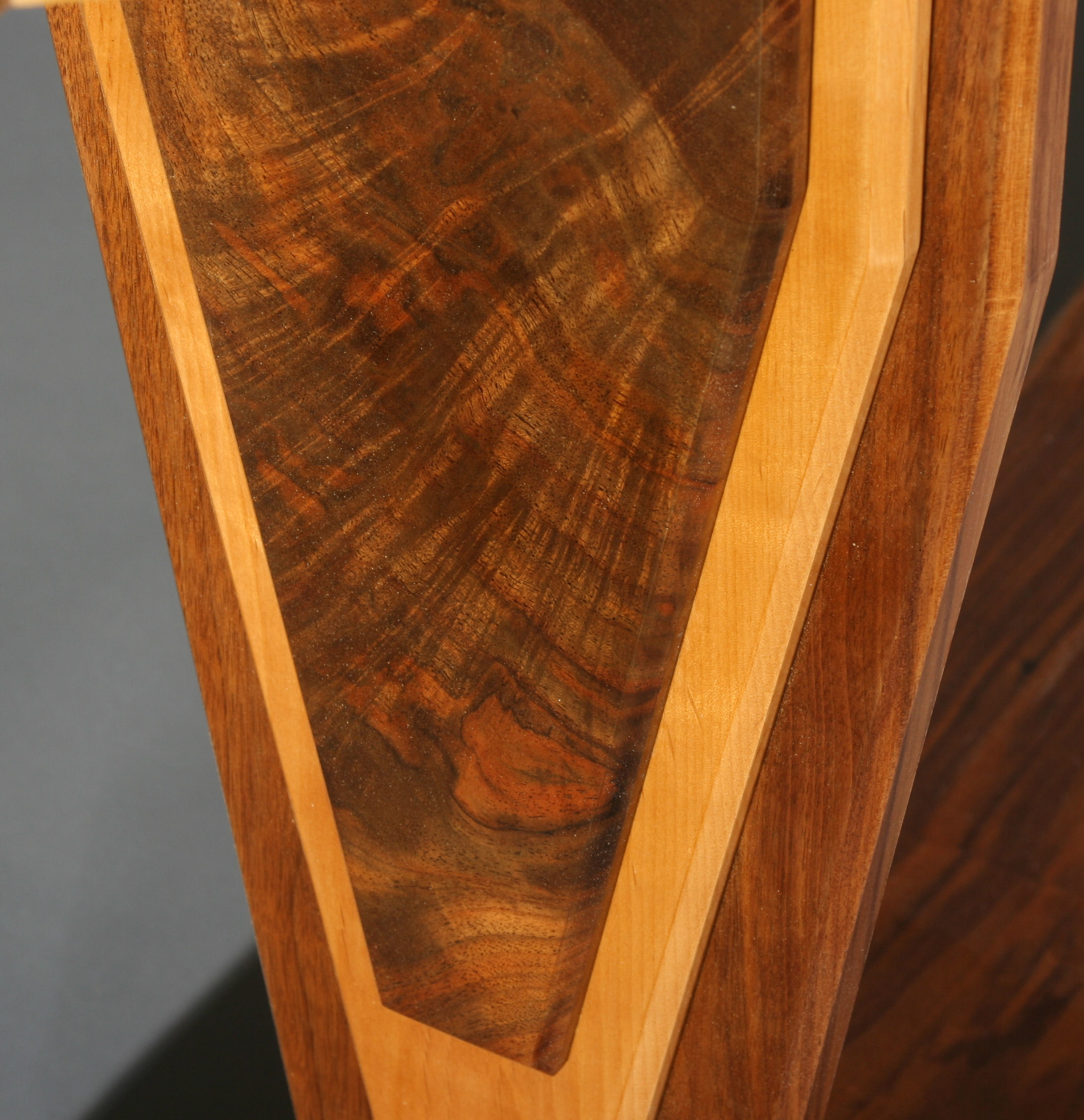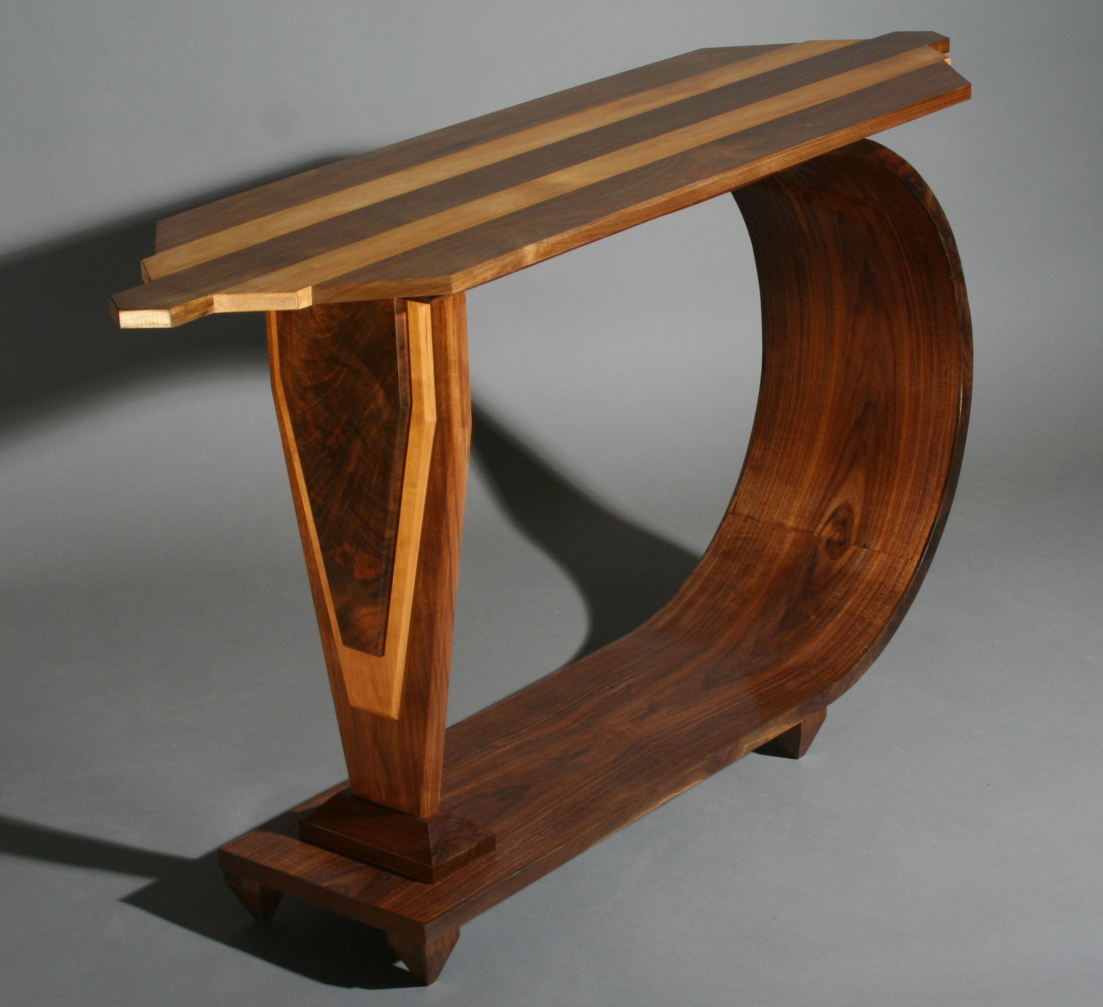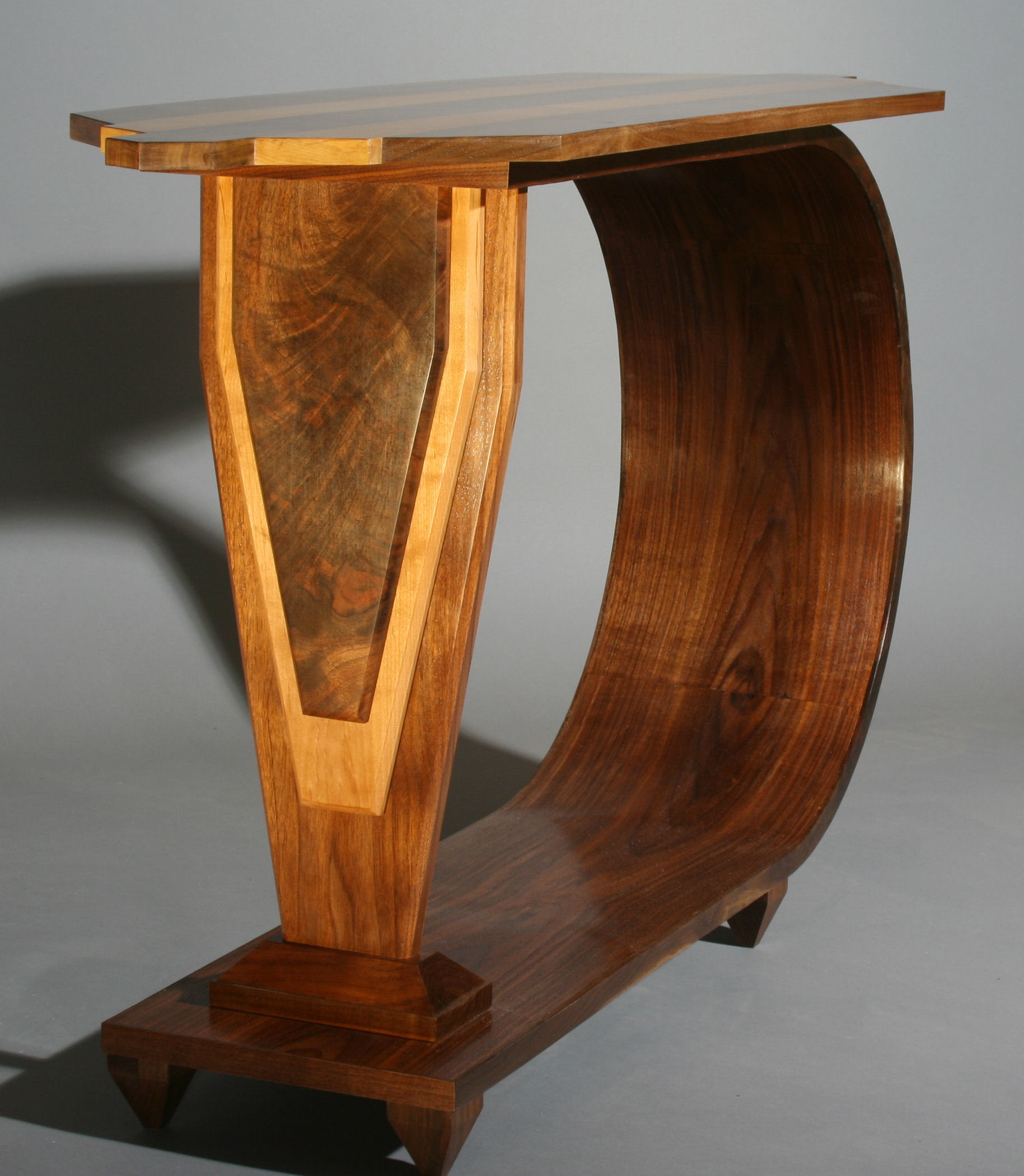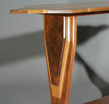 The Moderne style was one of the iconic styles of 1920s or the Art Deco period. Probably the most familiar of Art Deco style to most Americans is the Chrysler building in New York City, but the Normandie Hotel in San Juan, Puerto Rico may be one of best examples of the Streamline Moderne style, which is the basis for this table. Walnut and maple are the woods, with the maple highlights setting off the dramatic figure of the walnut.