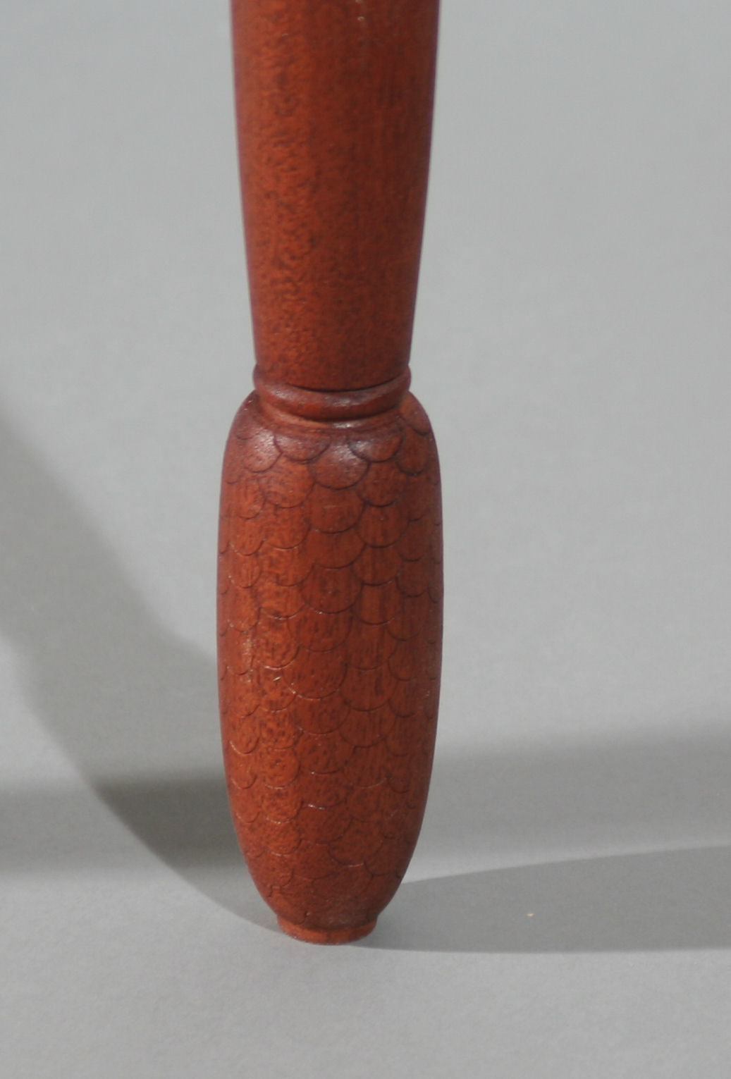 A demilune (halfmoon) table of cherry and mahogany. Demilune style tables were designed to sit against a wall, orginally between two large windows. Even today they are statement pieces sitting in an entryway or wide hallway. This piece was designed to use a material that is unfortunately common in Arizona, the bark of pinyon pine trees that has fallen from dead trees. The inside of the bark has a wonderful textured "bubbly" surface and I developed techniques to flatten the bark and use it in the inserts on the table apron here. The legs are turned in the shop and the feet have subtle pinecone texture added by hand.