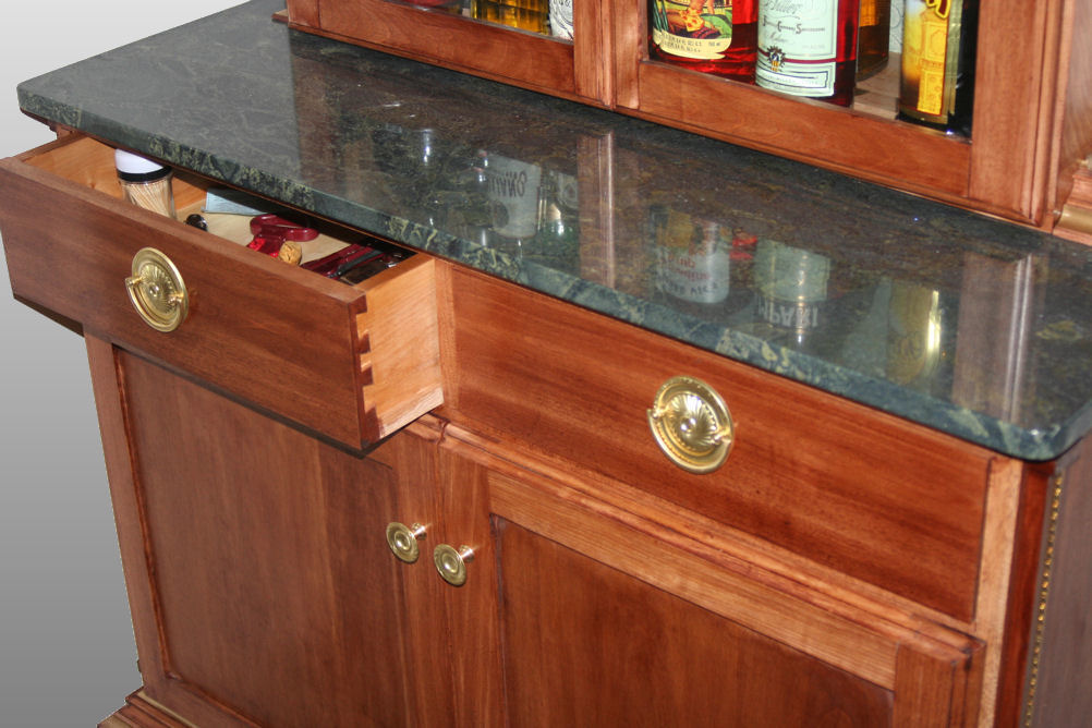 This liquor cabinet was designed to complement an existing French Empire style vitrine (glass display case) . All the trim moldings were custom made in-shop to match those of the vitrine and the feet of this piece were lathe-turned to match the feet of the vitrine and . The original vitrine has lovely beveled glass and I built these doors using glass with the same bevel. The surface of the midlevel setback is verde granite, a reference to the marble used in original empire pieces (but much easier to maintain). The cabinet is made of birch which has been dyed to deepen the color. Both the top and bottom cases are hand-dovetailed together for strength, even though this detail is mostly hidden by molding and by using half-blind dovetails. The drawers are hand-dovetailed as well.