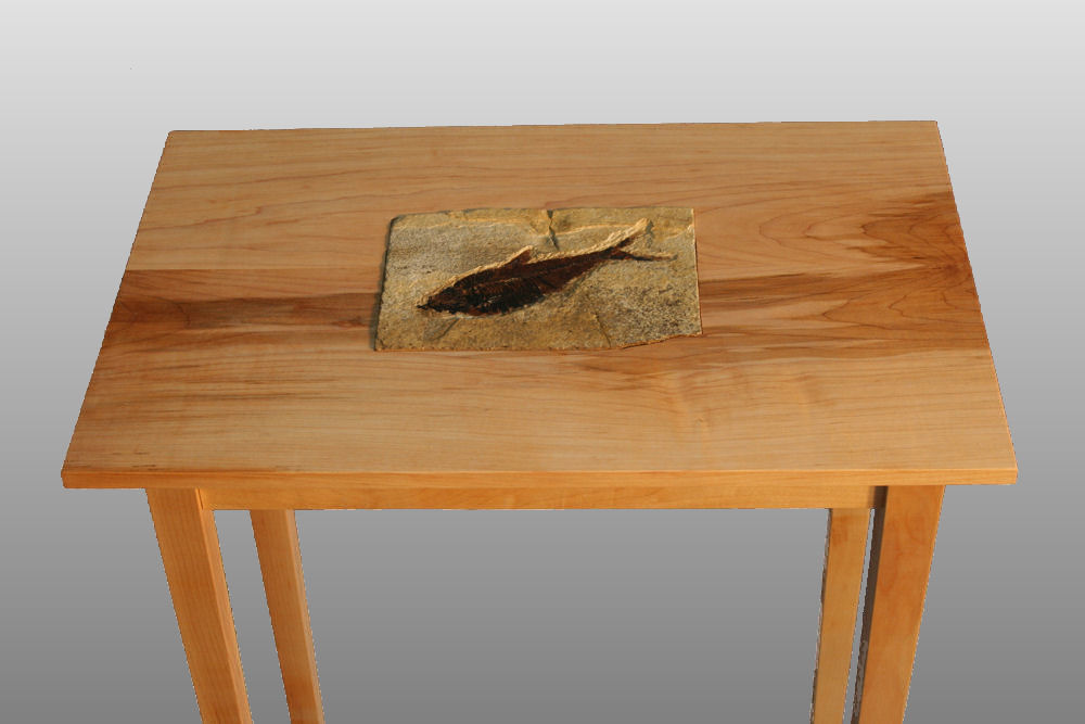 Built for two biologists, this table incorporates an actual fish fossil into the top. The table base is maple, the top is birch with a hand-rubbed oil finish with a wax topcoat.
