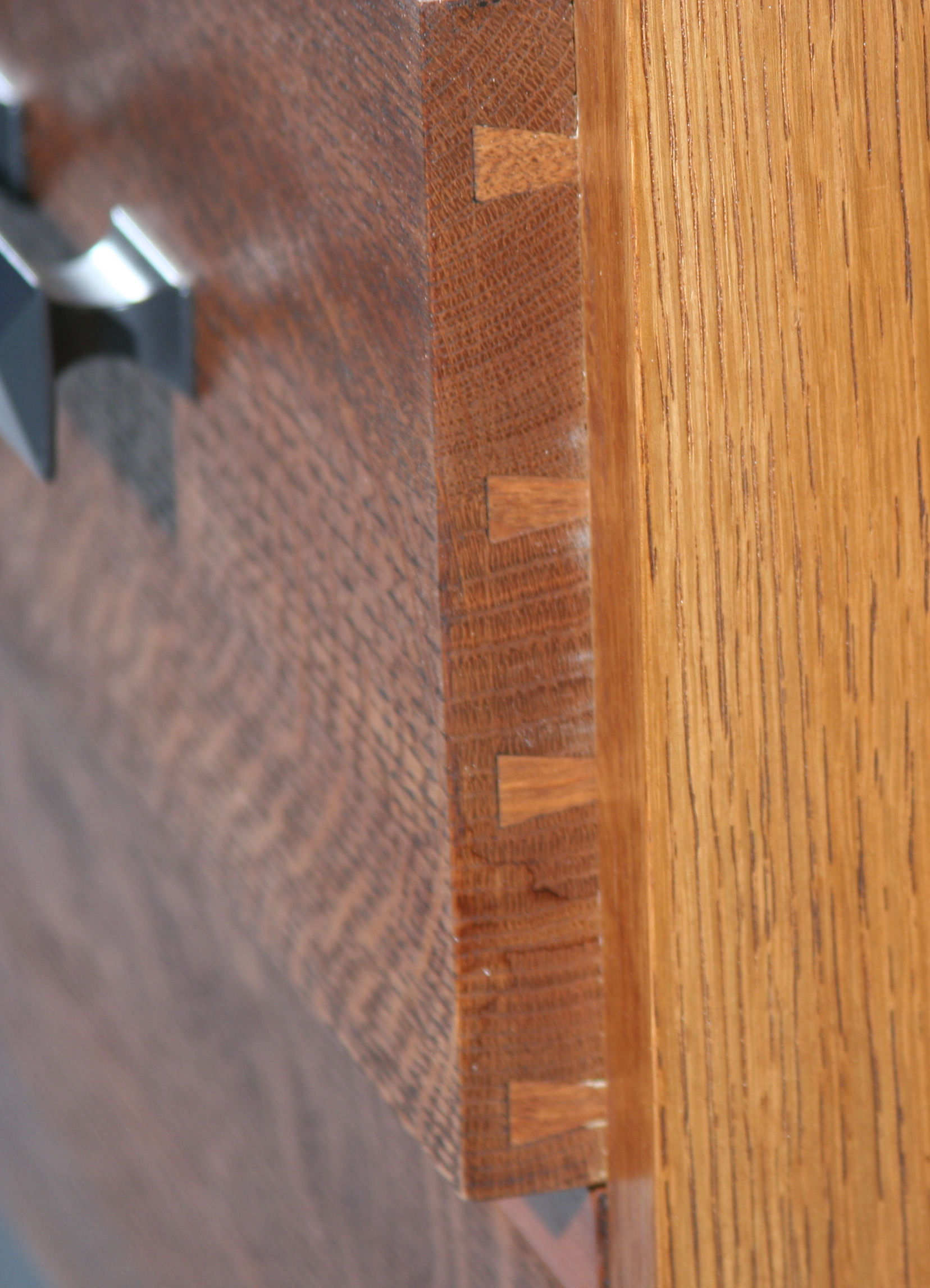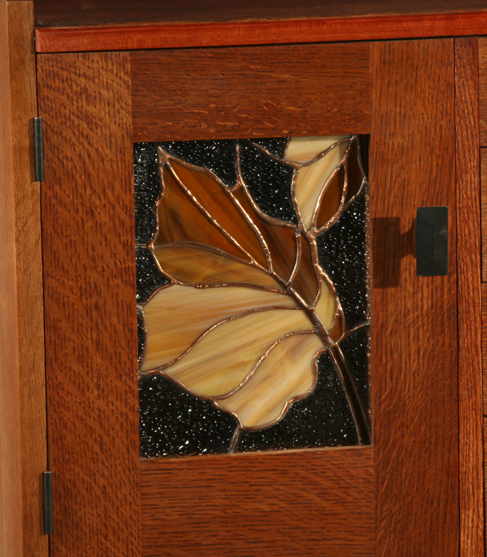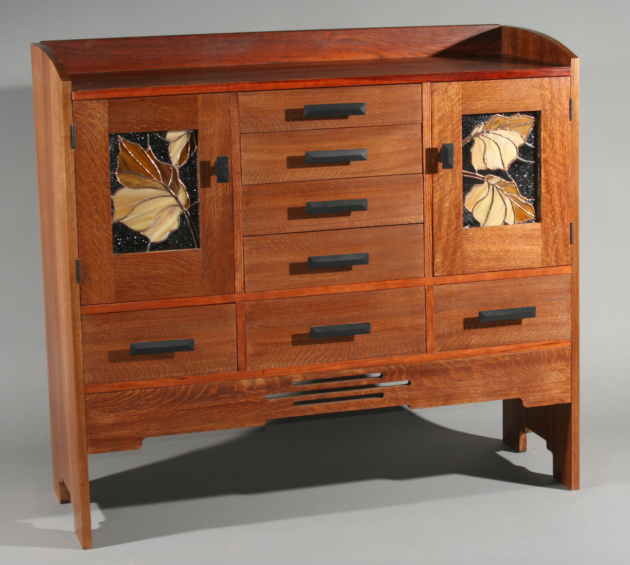 A sideboard in the Arts and Crafts style, of red oak. Included are features from the beautiful furniture of Greene and Greene, architects of the Ultimate Bungalows in California. The "cloud lift" features in the lower apron is a common theme in the work of Greene and Greene. The stained glass inserts in the doors were done by local Flagstaff artisan, Dick Coast. The finish is dyed shellac. There are horizontal cherry highlights that will become deeper red with the passage of time and increase in contrast to the oak.